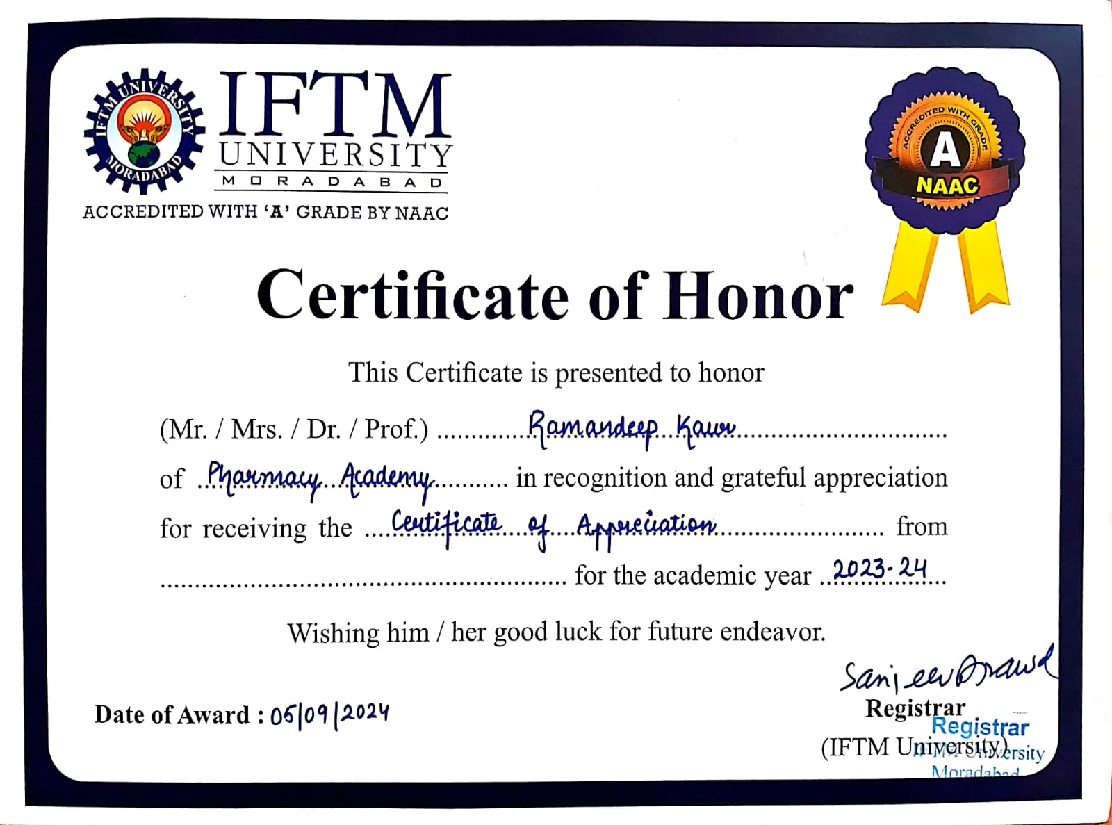 | 35 | RAMANDEEP KAUR | CERTIFICATE OF APPRECIATION | CERTIFICATE OF APPRECIATION | 2024-09-05 | |
