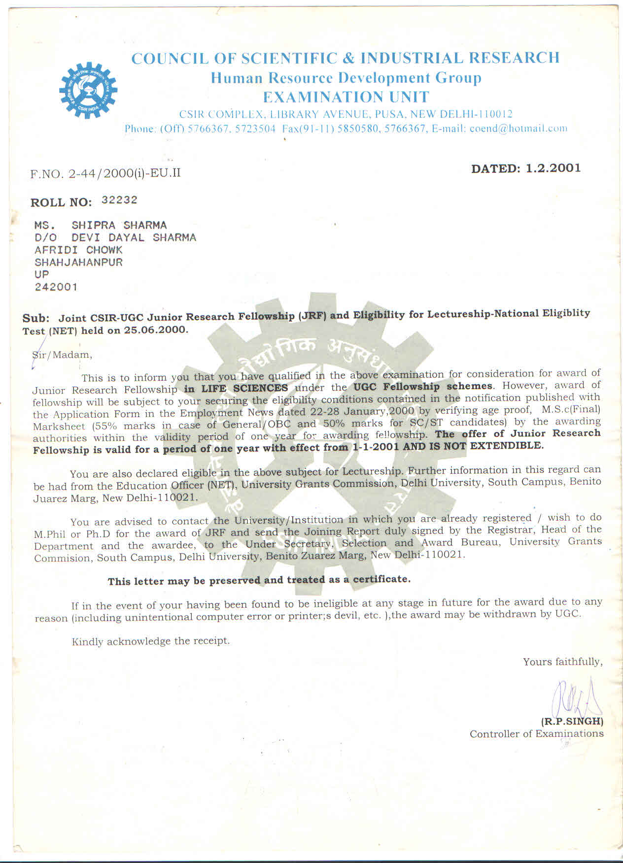 | 477 | SHIPRA SHARMA | CSIR-JRF | FELLOWSHIP | 2001-02-01 | |