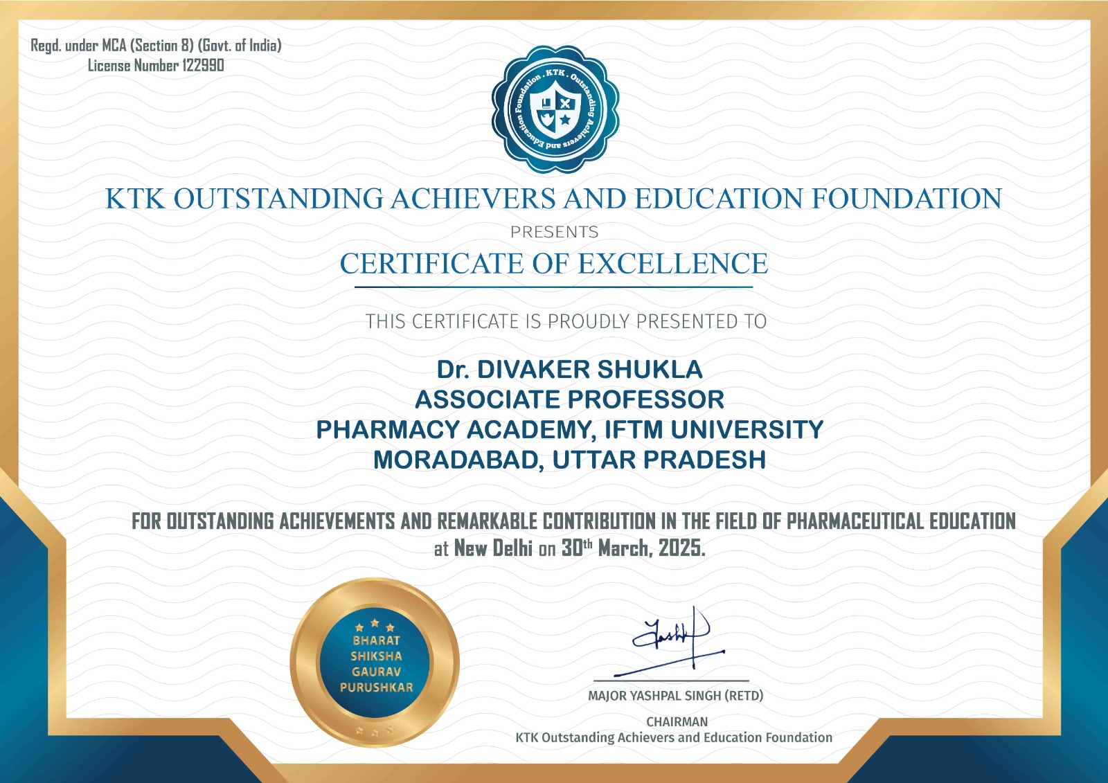 8DR DIVAKER SHUKLABHARAT SHIKSHA GAURAV PURUSHKAROUTSTANDING ACHIEVEMENTS AND REMARKABLE CONTRIBUTION IN THE FIELD OF PHARMACEUTICAL EDUCATION 2025-03-30