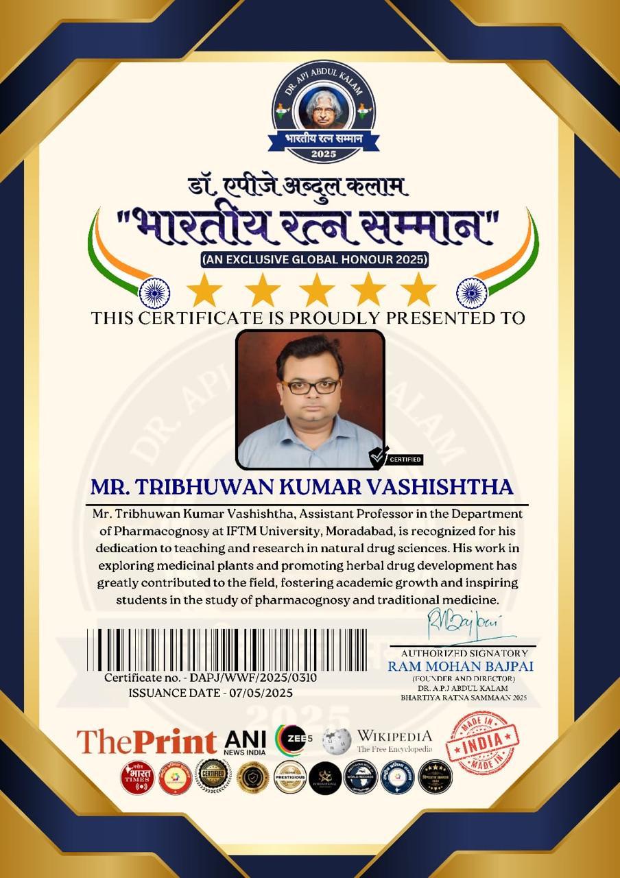11TRIBHUWAN KUMAR VASHISHTHADR. A.P.J. ABDUL KALAM "BHARTIYA RATNA SAMMAAN" 2025RECOGNIZED FOR DEDICATION TON TEACHING AND RESEARCH IN NATURAL DRUG SCIENCES2025-05-07