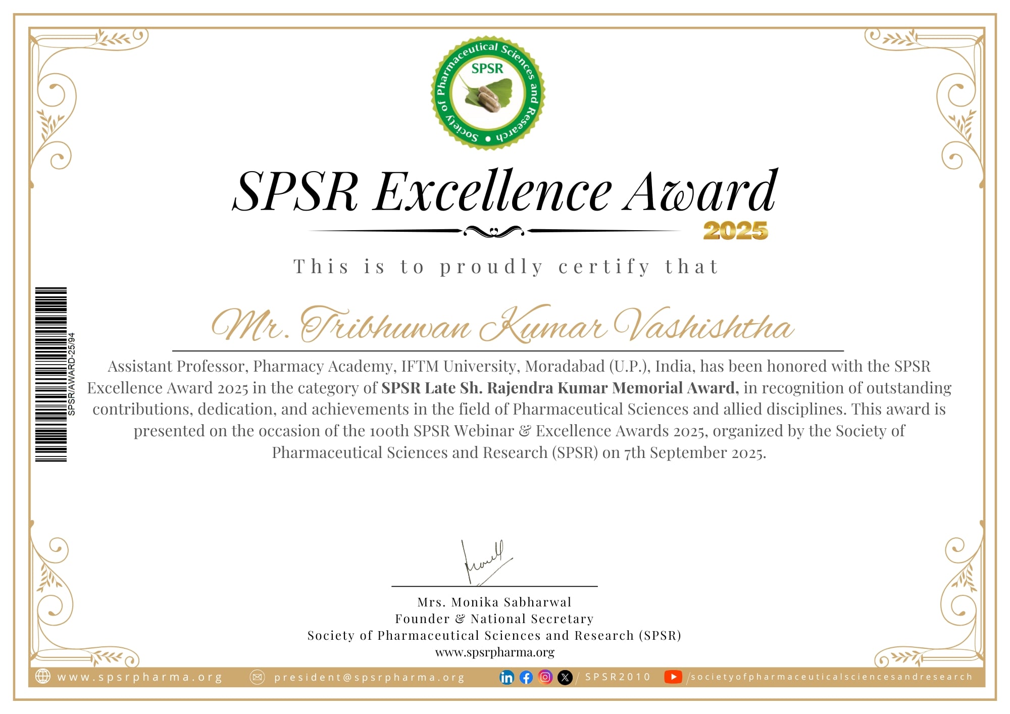 17TRIBHUWAN KUMAR VASHISHTHASPSR EXCELLENCE AWARD SPSR LATE. SH. RAJENDRA KUMAR MEMORIAL AWARD, IN RECOGNITION OF OUTSTANDING CONTRIBUTIONS, DEDICATION, AND ACHIEVEMENTS IN THE FIELD OF PHARMACEUTICALSCIENCES AND ALLIED DISCIPLINES. THIS AWARDIS PRESENTED ON THE OCCASION OF 100TH SPSR WEBINAR & EXCELLENCE AWARDS 2025 LINK: (HTTPS://YOUTUBE.COM/LIVE/OCA-3GICJOU?FEATURE=SHARE)2025-09-07