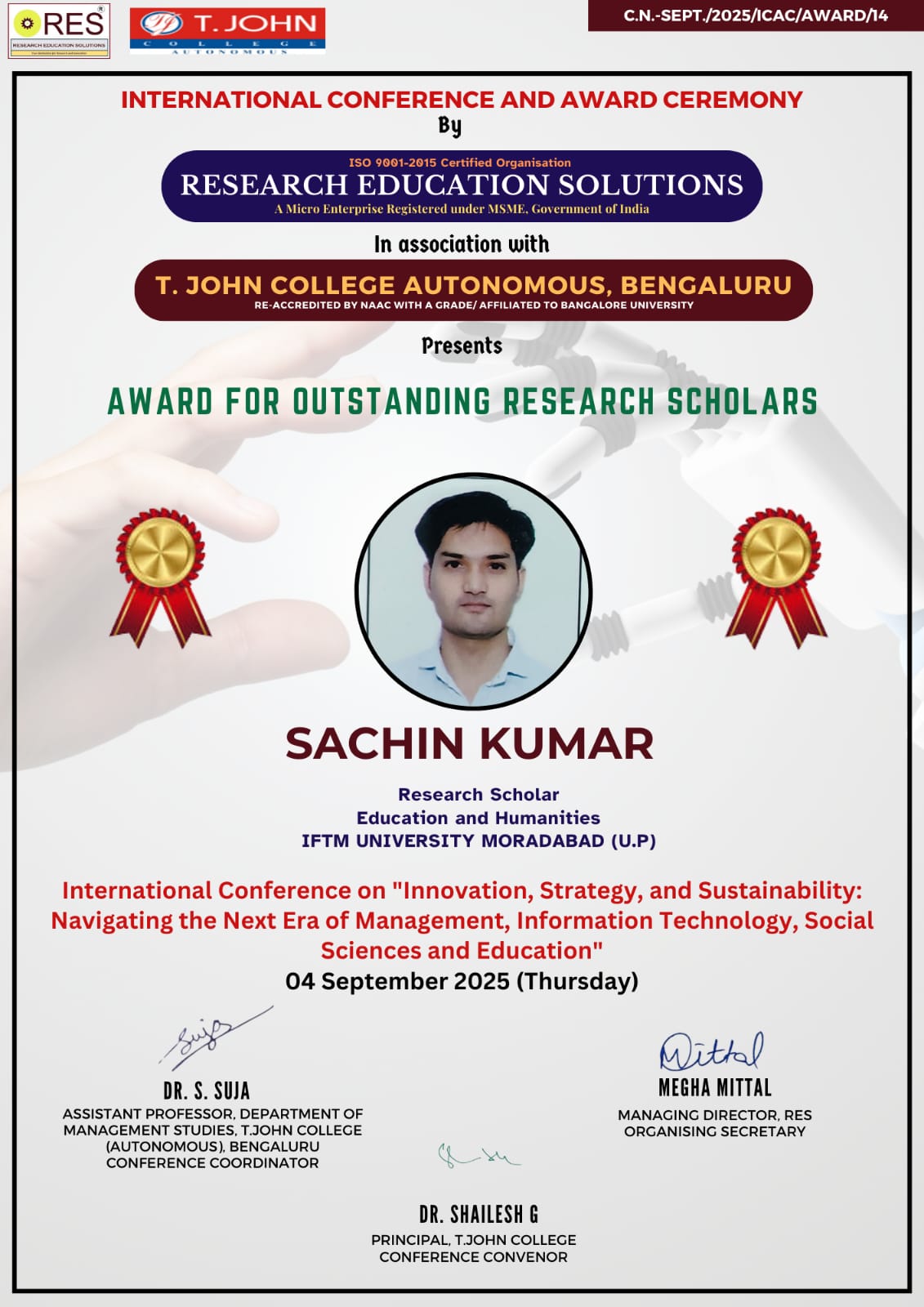20MR. SACHIN KUMAR AWARD FOR OUTSTANDING RESEARCH SCHOLARS INTERNATIONAL CONFERENCE ON "INNOVATION, STRATEGY, AND SUSTAINABILITY: NAVIGATING THE NEXT ERA OF MANAGEMENT, INFORMATION TECHNOLOGY, SOCIAL SCIENCES AND EDUCATION"2025-09-04
